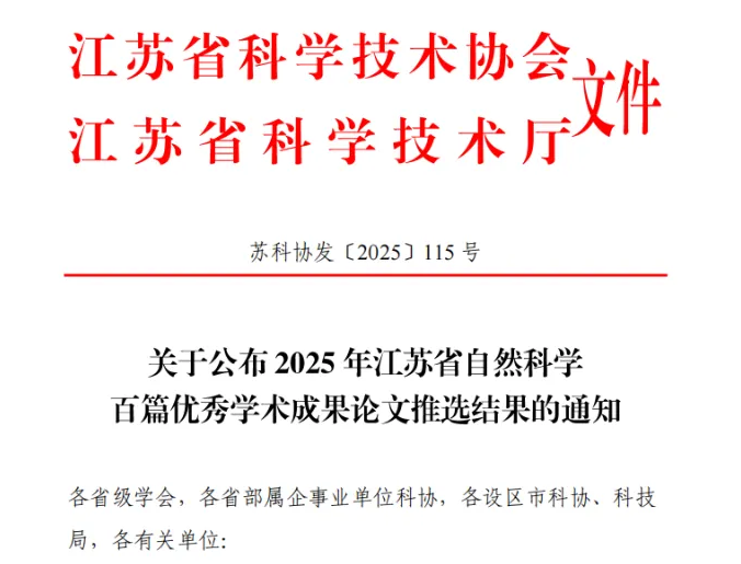 近日,江苏省科学技术协会发布了《关于公布2025年江苏省自然科学百篇优秀学术成果论文推选结果的通知》。